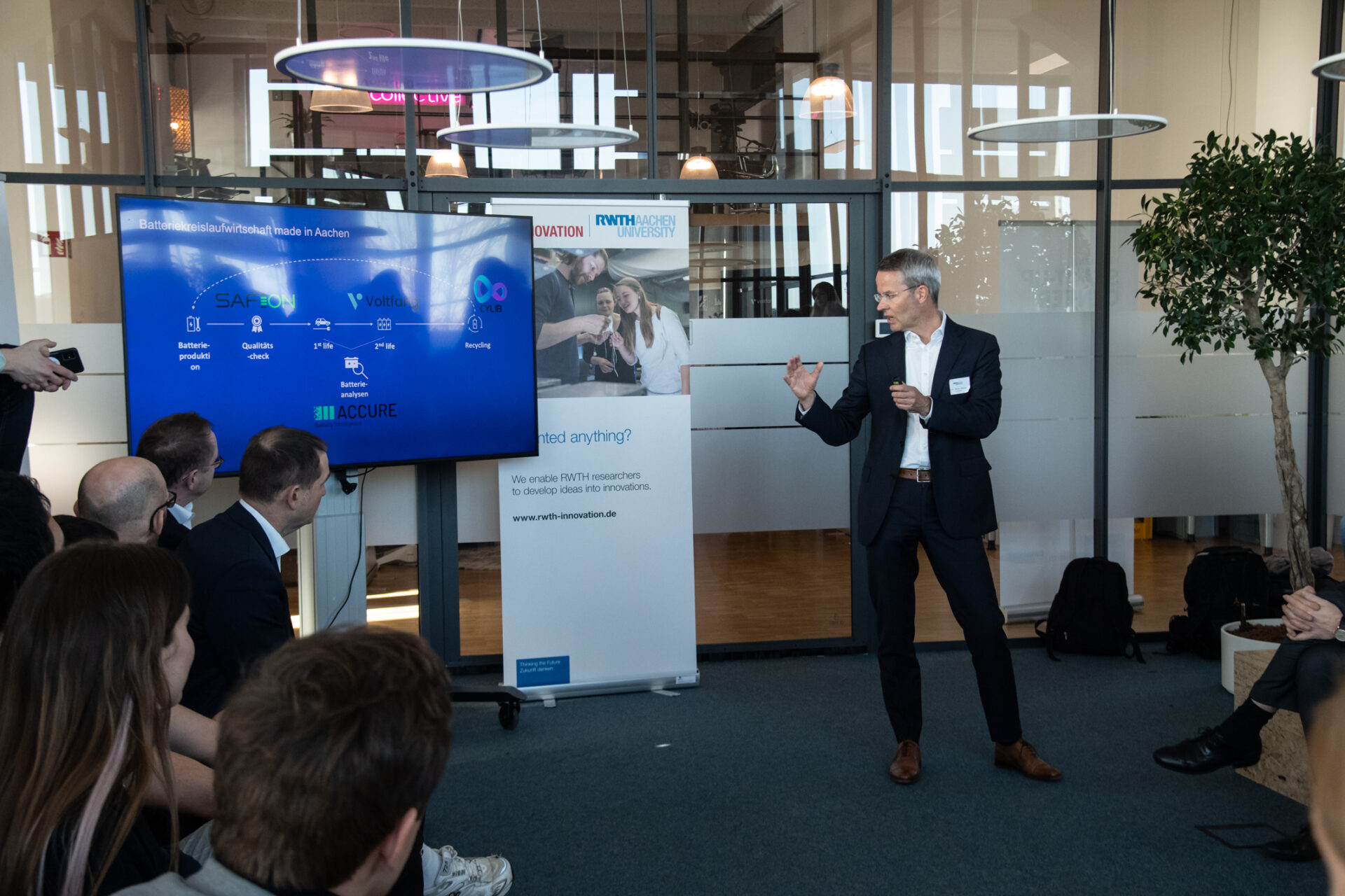Ministerin Neubaur war im Rahmen ihrer GreenTech-Tour zugegen und wollte sich aus erster Hand über Innovationen im Bereich nachhaltiges und zukunftsverträgliches Wirtschaften informieren. Und dafür ist unsere RWTH bekanntermaßen prädestiniert. Hier trafen wir auf verschiedene Start-Ups in den Bereichen Batterietechnologie und Mobilität, die uns ihre ausgeklügelten Geschäftskonzepte vorstellten.